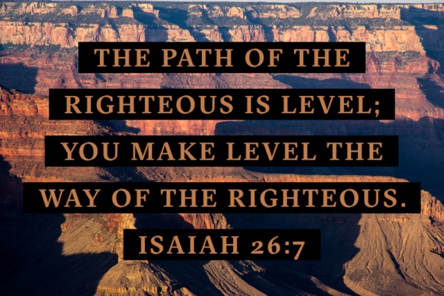 So. Through Christ Jesus, all who believe in him are made righteous through his death on the cross. To apply this to Isaiah 26:7, the ESV Study Bible notes say, “God’s promises lead along a path straight and true to fulfillment.” (5) What I would say is that “the path of the perfected person is level.” And “God makes level the path of the one who is made perfect by faith in Christ.”